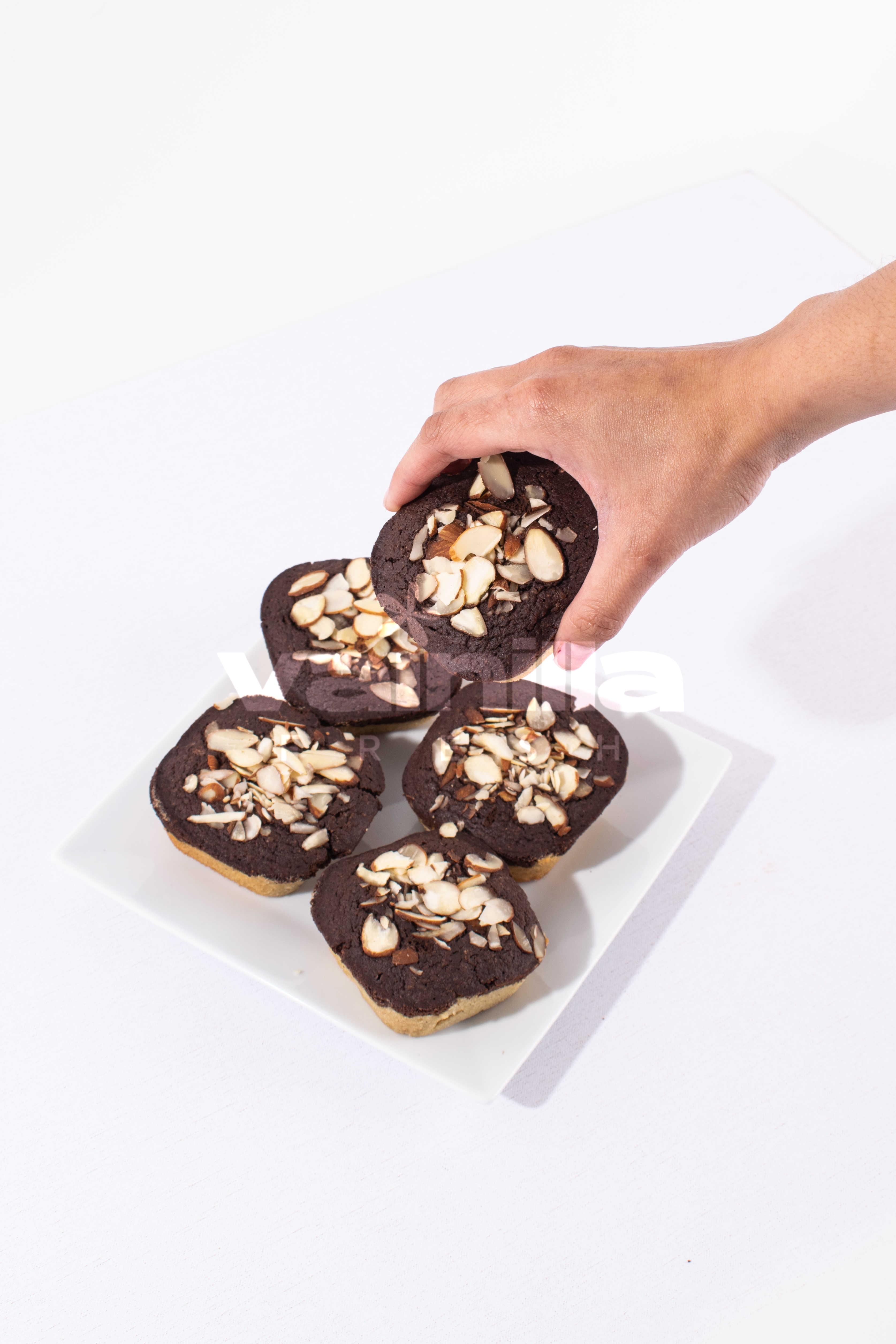 Hechas con harina de almendras y de coco, endulzadas con eritritol, con topping de chocolate y almendras fileteadas.